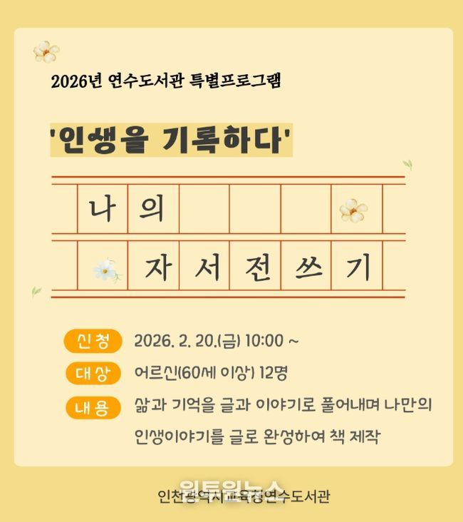 모집은 20일 오전 10시부터 연수도서관 누리집 또는 전화로 선착순 진행되며 60세 이상 지역 내 어르신이면 신청할 수 있다.