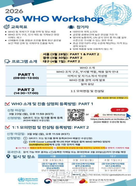 워크숍은 WHO(세계보건기구) 진출에 관심이 있는 대한민국 국민이라면 누구나 지원할 수 있다. 참가 신청은 2026년 3월 23일까지 포스터에 게재된 방법을 통해 온라인으로 신청할 수 있다.