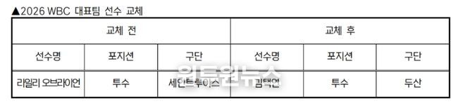 (원투원뉴스) KBO 전력강화위원회는 부상으로 인해 WBC 참가가 어려워진 세인트루이스 라일리 오브라이언을 대체할 선수로 두산 김택연을 확정하고 WBC 조직위에 선수 교체 승인을 요청했다.
