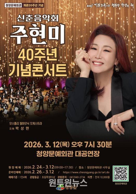 (원투원뉴스) 청양군이 오는 3월 12일, 데뷔 40주년을 맞이한 국민 가수 주현미를 초청해 ‘2026 신춘음악회’를 청양문예회관 대공연장에서 개최한다.