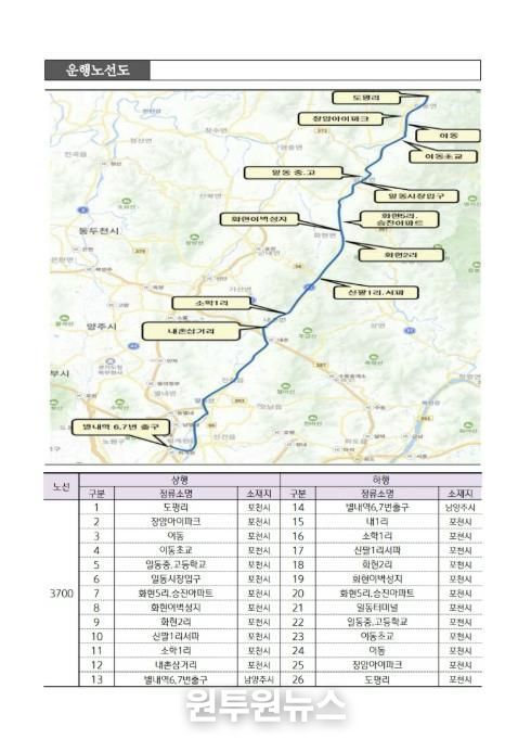 (원투원뉴스) 포천시는 오는 3월 4일부터 경기도 광역 공공버스 신규 노선인 3700번(도평리–별내역)을 정식 운행한다고 밝혔다.