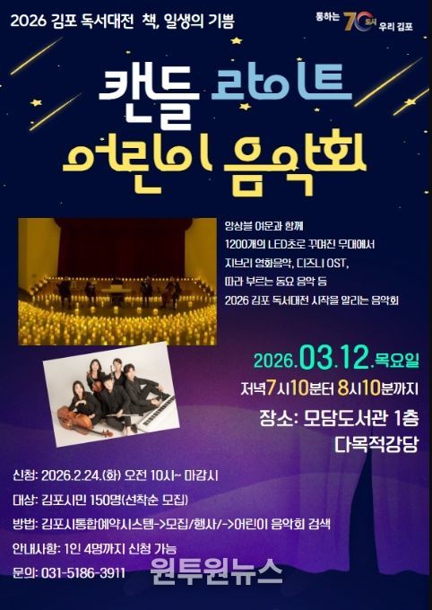 (원투원뉴스) 김포시 도서관은 2026 김포 독서대전의 시작을 알리는 공연으로 '캔들 라이트 어린이 음악회'를 2026년 3월 12일 19시 10분부터 20시 10분까지 모담도서관 1층 다목적강당에서 진행한다.
