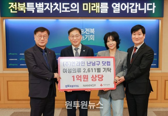 (원투원뉴스) 전북특별자치도는 20일 도청에서 ㈜엔라인이 운영하는 온라인 여성의류 쇼핑몰 ‘난닝구닷컴’의 의류 기탁식을 개최했다.