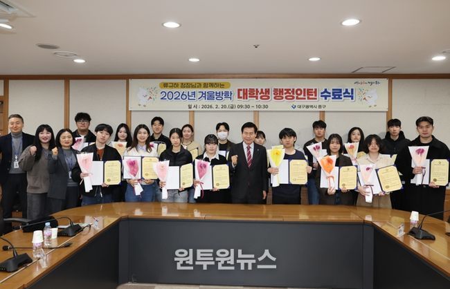 (원투원뉴스) 대구 중구는 지난 20일 구청 상황실에서 ‘2026년 겨울방학 대학생 행정인턴 수료식’을 개최했다.