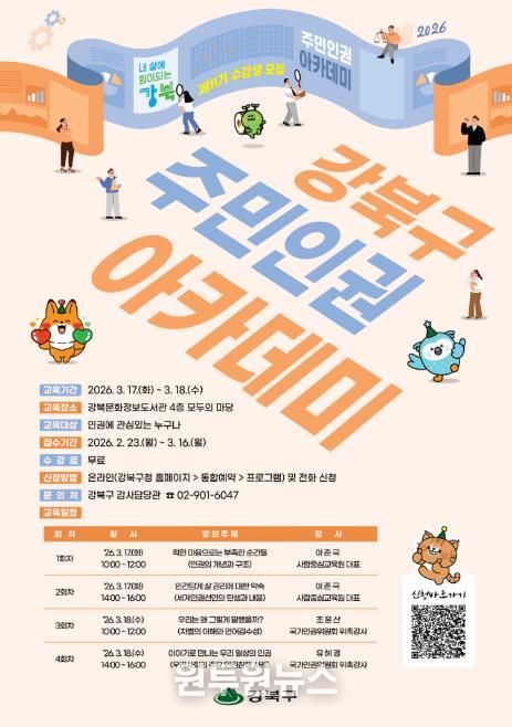 (원투원뉴스) 서울 강북구는 생활 속 인권 존중 문화를 확산하고 인권 친화적 지역사회를 조성하기 위해 ‘2026년 제11기 강북구 주민 인권아카데미’를 운영한다고 밝혔다.