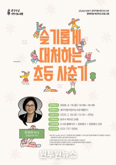 (원투원뉴스) 원주시 생각자람어린이도서관은 다음 달 14일 오후 2시, ‘슬기롭게 대처하는 초등 사춘기’를 주제로 ‘함께자람 부모학교’ 프로그램을 운영한다.