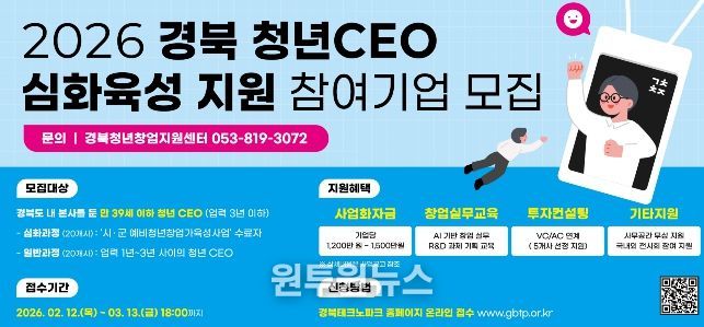 (원투원뉴스) 경상북도는 창업 초기 청년기업의 안정적인 정착과 성장을 지원하기 위해 오는 3월 13일까지 ‘2026 경북 청년CEO 심화육성 지원사업’참여 기업 40개사를 모집한다.
