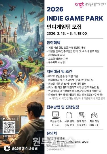 (원투원뉴스) 충남콘텐츠진흥원 산하 충남글로벌게임센터가 ‘인디게임파크 인큐베이팅’ 참가자를 모집한다.
