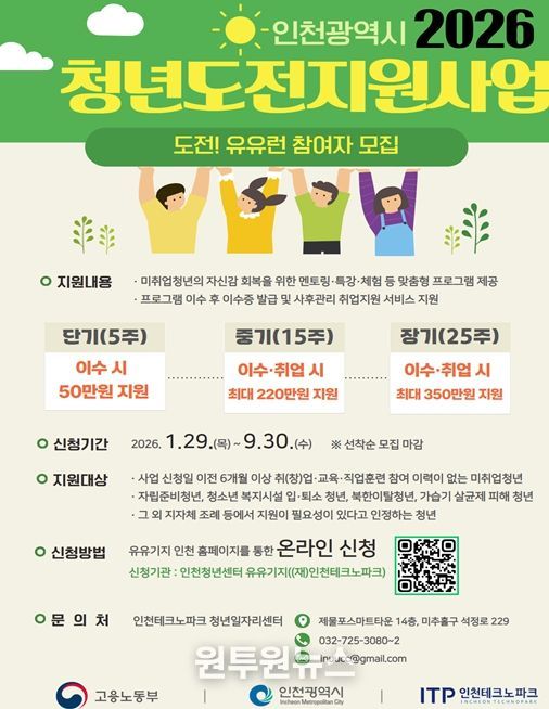 (원투원뉴스) 인천광역시는 청년의 경제활동 참여와 노동시장 진입을 지원하기 위해 ‘청년도전지원사업’ 참여자를 1월 29일부터 9월 30일까지 모집한다고 밝혔다.