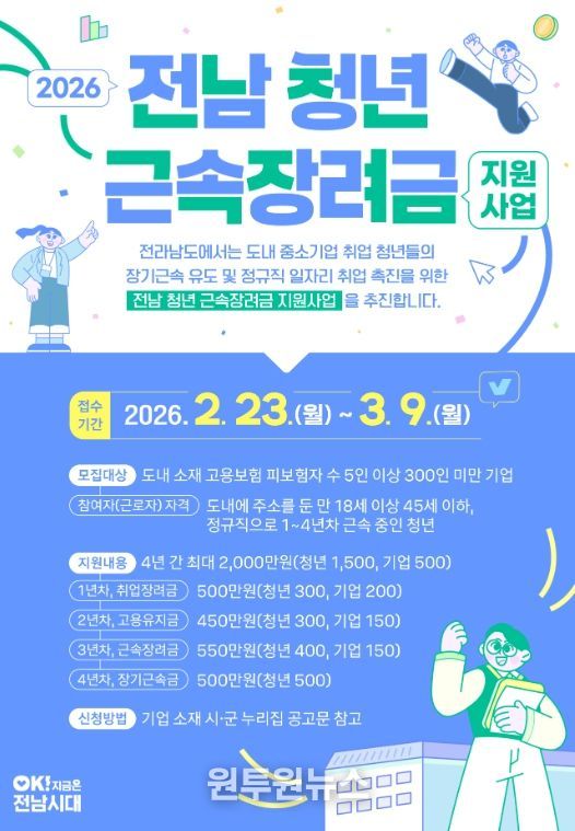 (원투원뉴스) 전라남도가 지역 중소기업의 인력난을 완화하고 청년의 지역 정착을 지원하기 위해 ‘2026 전남 청년 근속장려금 지원사업’ 참여기업을 오는 3월 9일까지 모집한다.