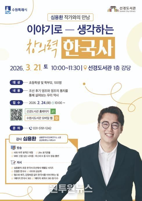 (원투원뉴스) 수원 선경도서관은 3월 21일 오전 10시 선경도서관 강당에서 ‘이야기로 생각하는 창의력 한국사’ 강연을 연다.
