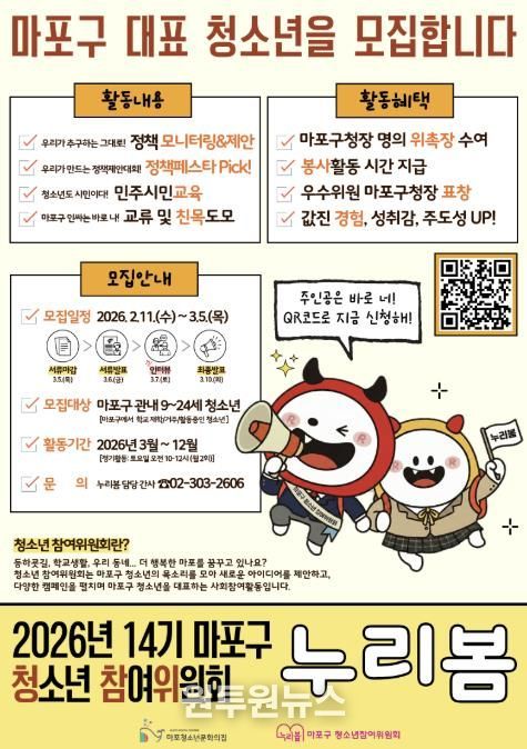 (원투원뉴스) 마포구는 청소년이 정책의 대상이 아닌 정책의 주체로 참여할 수 있도록 제14기 마포구 청소년참여위원회 ‘누리봄’ 위원을 모집한다.
