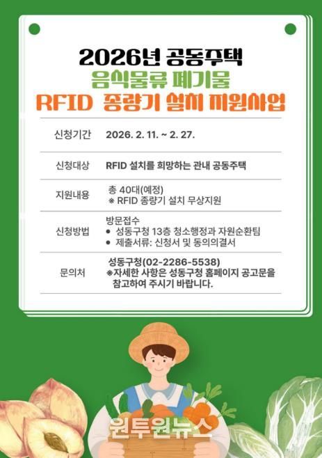 (원투원뉴스) 서울 성동구는 공동주택의 음식물류 폐기물 감량과 배출 편의 증진을 위해 음식물류 폐기물 RFID 종량기 설치 지원사업을 추진한다고 밝혔다.