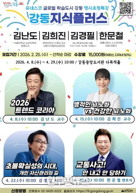 '강동지식플러스'는 매년 상·하반기 운영되는 강동구 대표 명사특강 프로그램이다. 이번 특강은 ‘100세까지 흔들리지 않는 삶의 길잡이’를 주제로 경제·건강·안전 등 각 분야 전문가 4인을 초청해 구민들에게 깊이 있는 지식과 실질적인 정보를 제공할 예정이다.