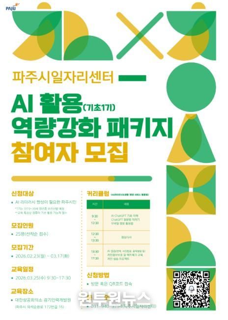 (원투원뉴스) 파주시는 파주시 일자리센터를 통해 경기인력개발원에서 운영하는 ‘인공지능(AI) 실무교육 1기’과정의 참여자 25명을 모집한다. 모집 기간은 2월 23일부터 3월 17일까지다.
