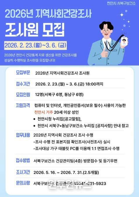(원투원뉴스) 천안시는 내달 6일까지 ‘2026년 지역사회건강조사’를 수행할 조사원을 모집한다고 23일 밝혔다.