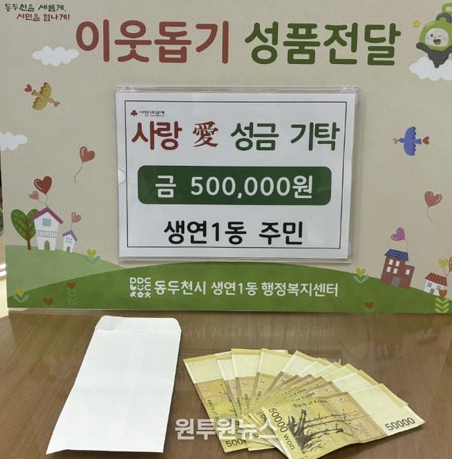 (원투원뉴스) 동두천시 생연1동 행정복지센터는 지난 20일 한 익명의 후원자가 어려운 이웃을 위해 써 달라며 현금 50만 원이 담긴 봉투를 전달했다고 밝혔다.