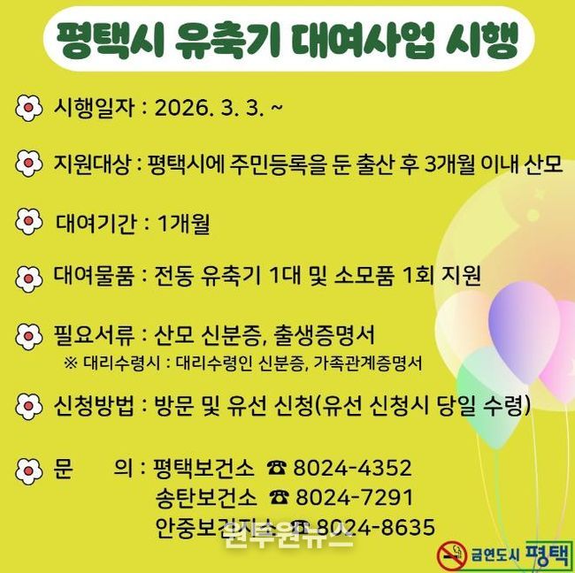 (원투원뉴스) 평택시는 출산 초기 산모의 경제적 부담을 덜고 안정적인 모유 수유 환경조성을 위해 오는 3월 3일부터 유축기 대여사업을 신규 시행한다고 밝혔다.