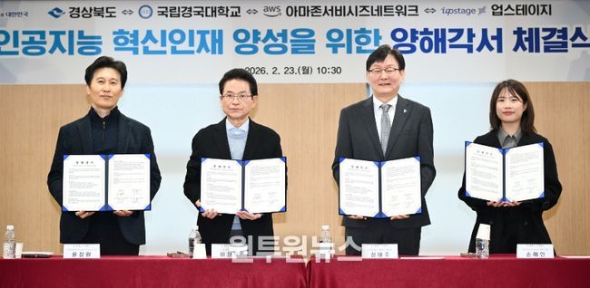 (원투원뉴스) 경상북도는 2월 23일 경북도청 사림실에서 국립경국대학교, 아마존웹서비시즈 코리아, 업스테이지와 함께 ‘인공지능 혁신인재 양성 및 공공·산업의 인공지능 전환 가속화’를 위한 4자 간 업무협약(MOU)을 체결했다.
