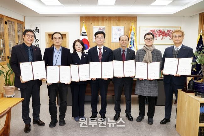 (원투원뉴스) 충청북도교육청은 23일, 서원대학교(총장 손석민), 세명대학교(총장 권동현), 충북문화재단(대표이사 김경식), 청주시문화산업진흥재단(대표이사 변광섭), 충북민예총(이사장 김덕근), 충북예총(회장 이영석) 등 지역 예술 기관‧단체와 함께 교육감실에서 '나도 예술가' 정책 추진과 안착을 위한 업무협약을 체결했다.