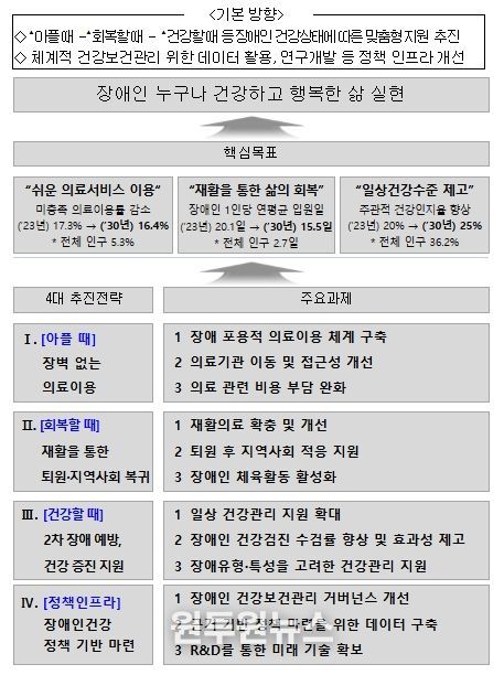 이에 정부는 장애인단체, 의료전문가 등 이해관계자의 의견수렴을 거쳐, ▲장벽 없는 의료이용, ▲재활을 통한 퇴원·지역사회 복귀, ▲2차 장애 예방, 건강 증진 지원, ▲장애인건강 정책 기반 마련을 중점전략으로 하여 12대 주요과제 및 32개 세부 추진과제를 제시했다.