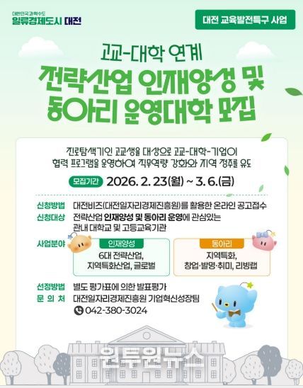(원투원뉴스) 대전시는 교육발전특구 사업의 일환으로‘고교-대학 연계 전략산업 인재 양성’및‘고교-대학 연계 동아리 운영’사업에 참여할 관내 대학을 모집한다.