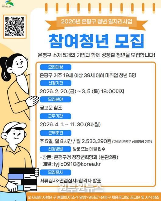 (원투원뉴스) 서울 은평구는 ‘2026년 청년 일자리사업’에 참여할 청년 5명을 다음 달 5일까지 모집한다고 밝혔다.