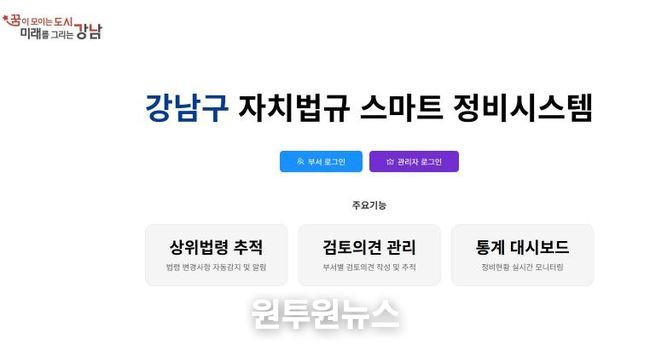 (원투원뉴스) 꿈이 모이는 도시, 미래를 그리는 강남구가 상위법 개정 사항을 신속하게 반영하기 위해 인공지능(AI)을 활용한 ‘자치법규 스마트 정비시스템’을 자체 구축했다.