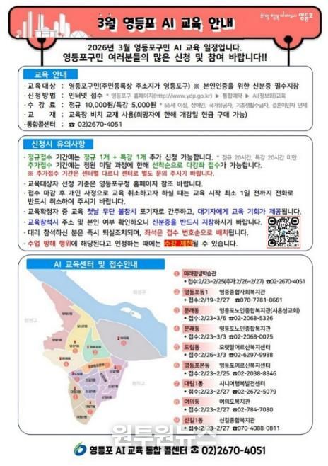(원투원뉴스) 영등포구가 3월부터 ‘구민 대상 인공지능(AI) 교육’을 본격 운영한다. 이번 교육은 AI를 활용해 문서를 작성하고 영상을 제작하는 등 실생활에 바로 적용할 수 있는 실습 중심 과정으로 구성됐다.