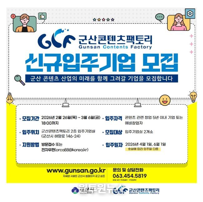 (원투원뉴스) 군산시가 콘텐츠 산업 창업 활성화 및 지역 기업 육성을 위해 군산콘텐츠팩토리 신규 입주기업 2개사를 모집한다.
