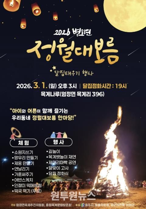 (원투원뉴스) 충주시는 오는 3월 1일 민족 고유의 절기인 음력 정월대보름을 맞아 엄정면 목계나루와 단월강변에서 정월대보름 행사를 개최한다고 24일 밝혔다.