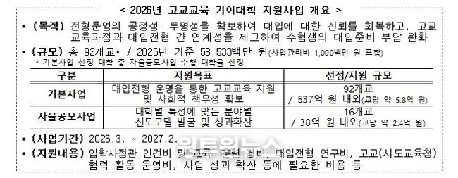 (원투원뉴스) 교육부은 2월 24일, ‘2026년 고교교육 기여대학 지원사업 기본계획’을 발표한다.