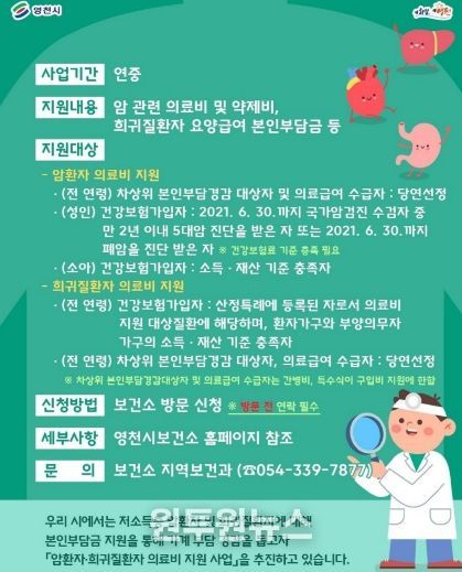 (원투원뉴스) 영천시는 경제적 부담으로 치료를 포기하는 일이 없도록 암환자와 희귀질환자를 대상으로 한 의료비 지원사업을 연중 추진한다고 24일 밝ㅈ혔다.