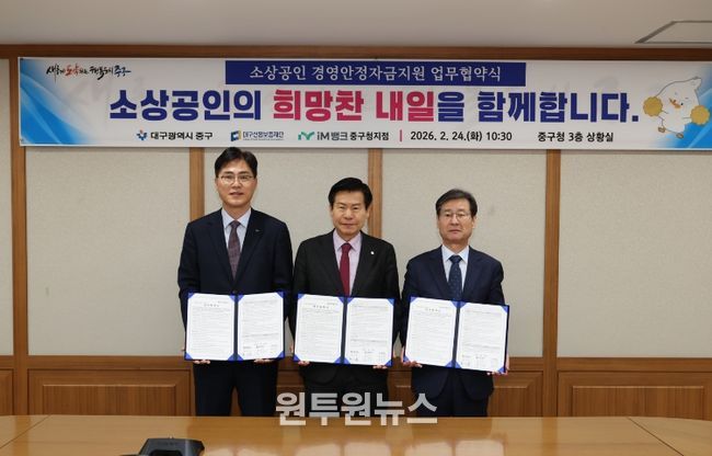 (원투원뉴스) 대구 중구는 지난 24일 구청 상황실에서 대구신용보증재단, iM뱅크 중구청지점과 업무협약을 체결하고 고금리 장기화와 내수 회복 지연으로 어려움을 겪는 소상공인의 자금난 해소와 이자 부담 완화를 위해 총 30억 원 규모의 ‘2026년 소상공인 경영안정자금’을 지원한다.