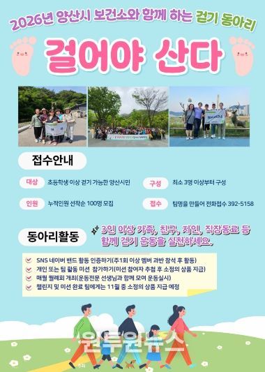 참여 신청은 초등학생 이상 걷기 운동이 가능한 양산 시민이라면 누구나 가능하며 팀 구성은 최소 3인에서 최대 10인까지 자유롭게 구성할 수 있다. 접수는 3월 3일부터 양산시보건소에서 진행되며 선착순으로 100명까지 참여할 수 있다.