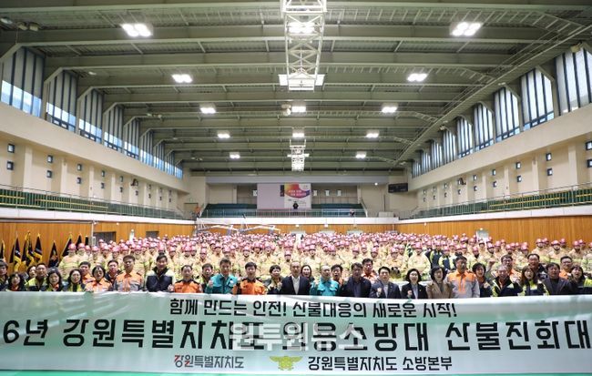 (원투원뉴스) 강원특별자치도는 2월 24일 원주에서 김진태 도지사와 김시성 도의회 의장을 비롯한 도의원, 관계기관장, 의용소방대원 등 800여 명이 참석한 가운데 전국에서 두 번째 사례로 '강원특별자치도 의용소방대 산불진화대 발대식'을 개최했다고 밝혔다.