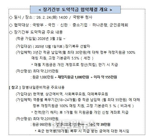 안규백 국방부장관 주관으로 2월 24일, 국방부 청사에서 국민은행, 신한은행, 중소기업은행, 하나은행, 군인공제회와 ‘장기간부 도약적금’ 업무협약을 체결하고, 협약 이행을 위해 상호 긴밀히 협력할 것을 약속했다.
