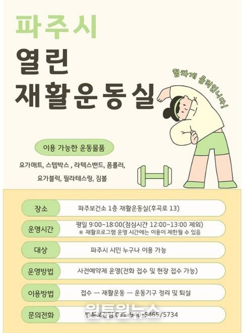 (원투원뉴스) 파주시는 오는 3월부터 파주보건소 1층 재활운동실에서 시민들의 건강한 일상을 지원하기 위한 ‘열린 재활운동실’을 운영한다.