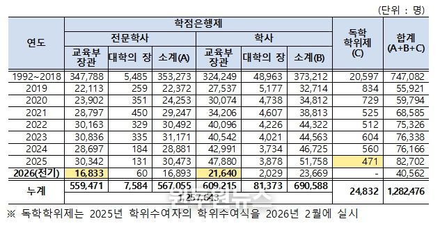 독학학위제(1990년~) 및 학점은행제(1997년~)가 시작된 이후, 2026년 2월 기준 누적 학위 취득자는 총 128만여 명(학점은행제 1,257,643명, 독학학위제 24,832명)에 이른다. 이는 우리 사회 전반에 평생학습 기반이 지속적으로 확대되어 왔음을 보여준다.