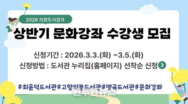 (원투원뉴스) 창원특례시 의창도서관과(과장 김외화)는 다양한 문화강좌를 통해 시민의 평생교육을 지원하고 문화생활의 기회를 제공하기 위해 ‘2026년 의창도서관과 상반기 문화강좌’ 수강생을 모집한다.