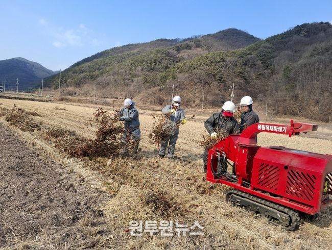 군은 지난 1월 신청 농가를 대상으로 산림재난대응단 소속 산불전문예방진화대를 투입해 고령농 등 32농가의 깻단과 고춧대 등 영농부산물 파쇄 작업을 완료했다.