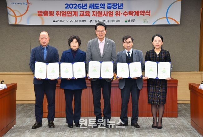 (원투원뉴스) 울산 울주군이 25일 군청 비둘기홀에서 이순걸 군수와 4개 수행기관 대표 등이 참석한 가운데 ‘새도약 중장년 맞춤형 취업연계 교육 지원사업’ 업무계약을 체결했다.