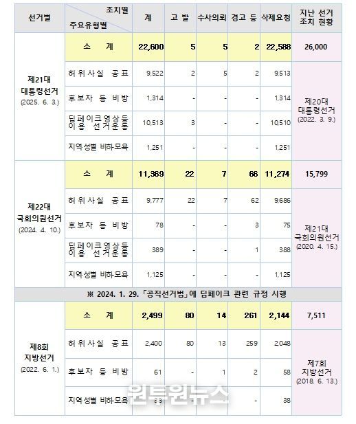 중앙선관위는 딥페이크 제작물이나 허위사실공표·비방 행위는 후보자에게 회복하기 어려운 피해를 줄 수 있고 유권자의 판단을 왜곡하여 선거결과에 영향을 미칠 수 있다면서, 깨끗한 사이버선거문화 조성을 위해 관계기관 등의 적극적인 협조를 요청했다.