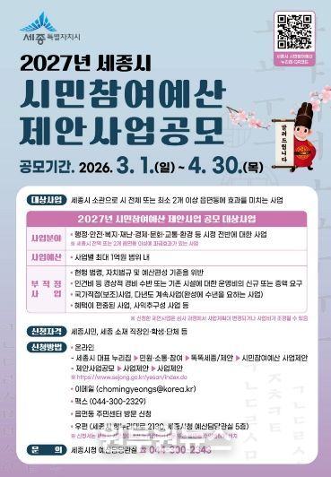 (원투원뉴스) 세종특별자치시가 오는 3월 1일부터 4월 30일까지 2027년도 예산편성을 위한 시민참여예산 제안사업 공모를 진행한다.
