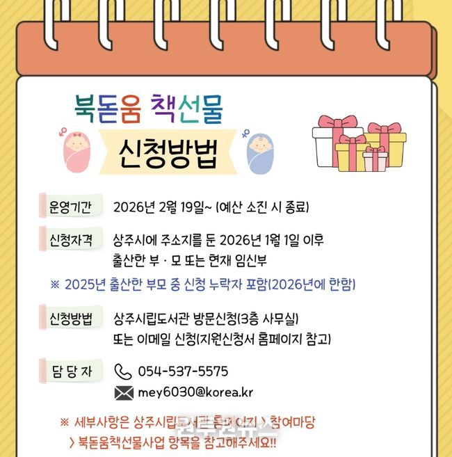 (원투원뉴스) 상주시립도서관이 경북도와 함께 '2026년 초보 엄마·아빠 북돋움 책선물 사업'을 시행한다.