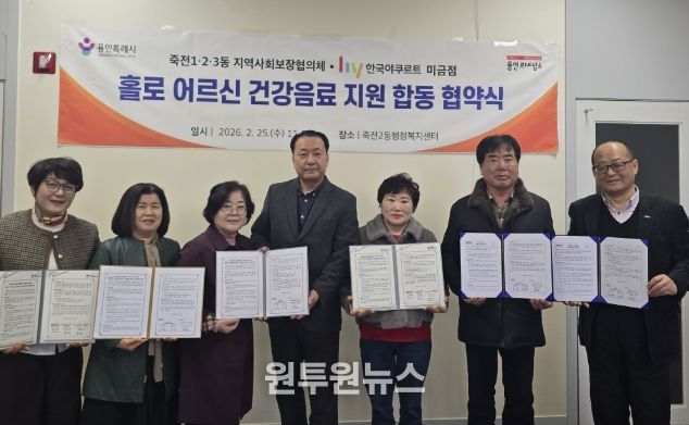 (원투원뉴스) 용인특례시 수지구 죽전1·2·3동 지역사회보장협의체는 25일 죽전2동 행정복지센터에서 ㈜hy 미금점과 ‘홀로어르신 건강음료 지원’ 사업 협약을 체결했다고 26일 밝혔다.