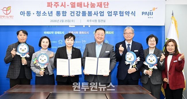 (원투원뉴스) 파주시는 25일 사회복지법인 열매나눔재단과 관내 취약계층 아동·청소년을 위한 통합 건강돌봄지원사업 업무 협약을 맺었다.