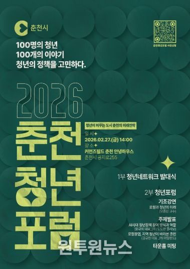 춘천시가 27일 커먼즈필드 안녕하우스에서 ‘2026 춘천시 청년네트워크 발대식 및 청년포럼’을 개최한다. 시는 앞서 공개 모집을 통해 제1기 청년네트워크 위원 30명을 선발했다. 이번 행사는 청년이 정책의 수혜자를 넘어 설계자로 참여하는 소통 창구를 공식화하고 ‘청년이 머무는 도시, 춘천의 미래전략’을 모색하기 위해 마련됐다.