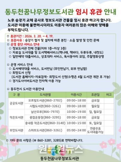 (원투원뉴스) 동두천시 도서문화사업소 꿈나무정보도서관은 노후 승강기 교체 공사 시행에 따라 오는 3월 20일부터 4월 19일까지 임시 휴관한다고 밝혔다.