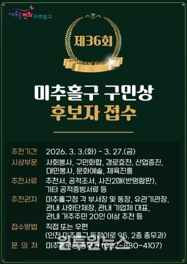 추천 서류는 미추홀구청 총무과로 직접 방문하거나 우편(미추홀구 독정이로 95, 미추홀구청 총무과)을 통해 접수할 수 있으며, 수상자는 미추홀구 구민상심의위원회의 심의를 거쳐 최종 결정된다. 시상은 5월 1일 제36회 구민의 날 기념식에서 진행될 예정이다.